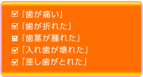 | などの緊急を要する場合においては、当院の患者さま、他院にかかられてる患者さまどちらのかたも、必ず当日中に処置を行わせていただきます。当院では急患を断ることはありませんので安心してご来院ください。 |