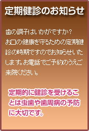 | 分からないこと、不安なことがありましたら、当院スタッフまたは歯科医師にお気軽にお尋ね下さい。 |